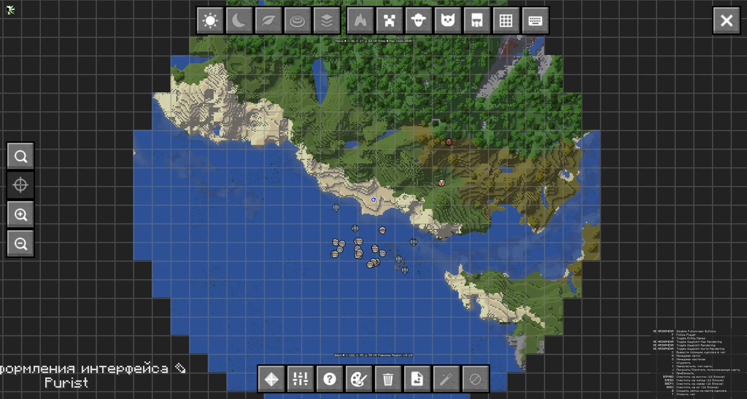 При помощи английской C выводится позиция курсора в чат, благодаря чему можно легко телепортироваться на нужное место. Есть также менеджер меток, который открывается на N. Для приближения игроки могут использовать клавишу =, а кнопка B создает метку на месте курсора.