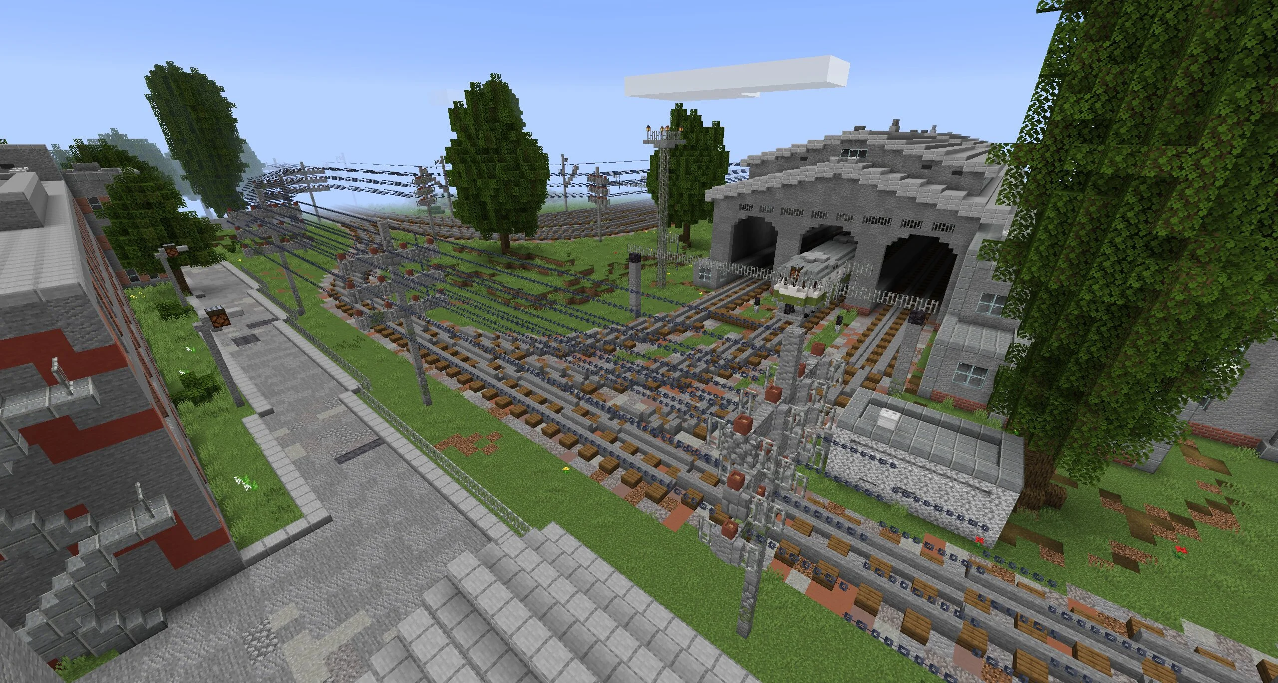 Возле города на карте блэк раша на Minecraft Java есть целая железнодорожная станция. На ней много путей — они декоративные, но красивые. А в длинном ангаре стоит неплохо смоделированный поезд с десятком вагонов.