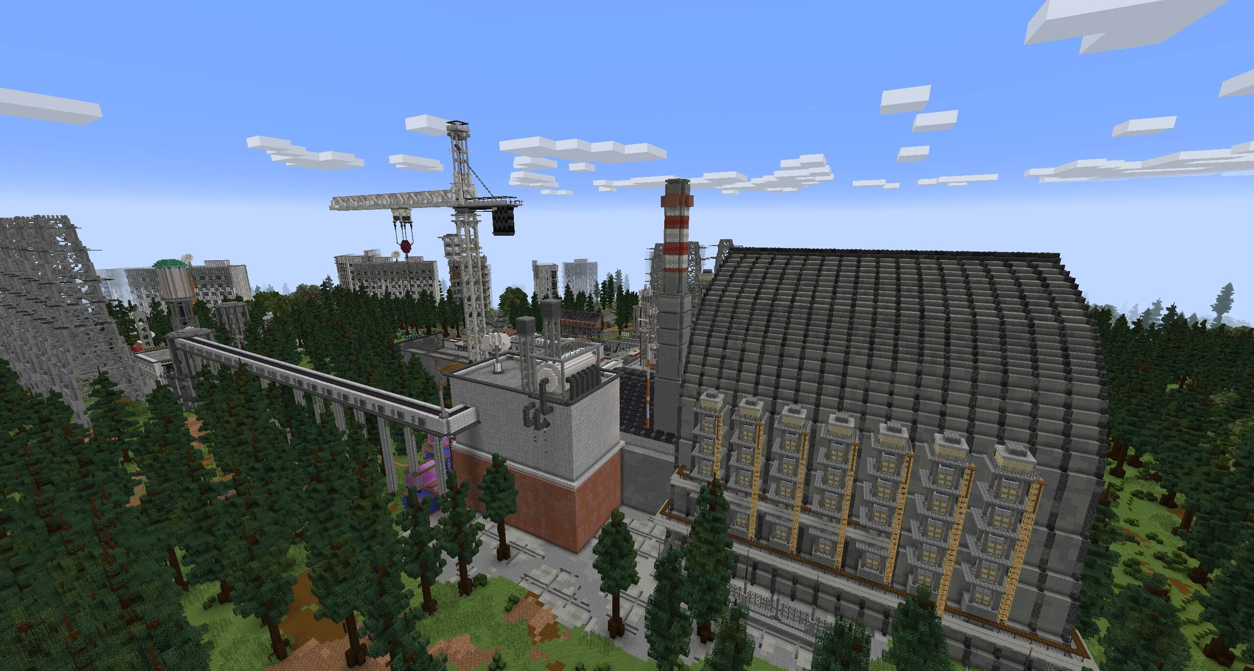 Сама станция на карте Чернобыля на Minecraft Java находится прямо возле Припяти. Масштаб здесь не выдержан в угоду интеесному геймплею. Игрокам не придется далеко бежать, чтобы увидеть саркофаг.