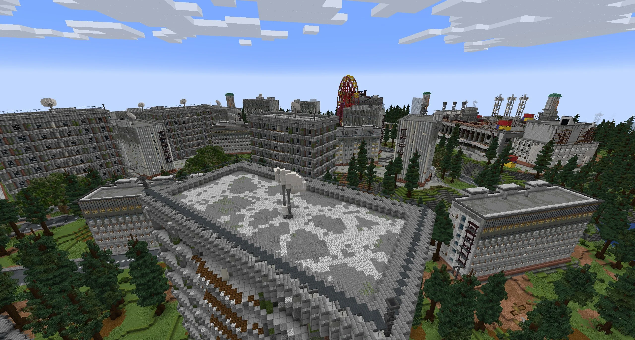 Через несколько минут путешествия по карте Чернобыля на Майнкрафт Ява на горизонте появятся высокие постройки. Это жилые дома знаменитой Припяти. Добравшись до черты города, игроки увидят колесо обозрение и другие хорошо известные архитектурные памятники.