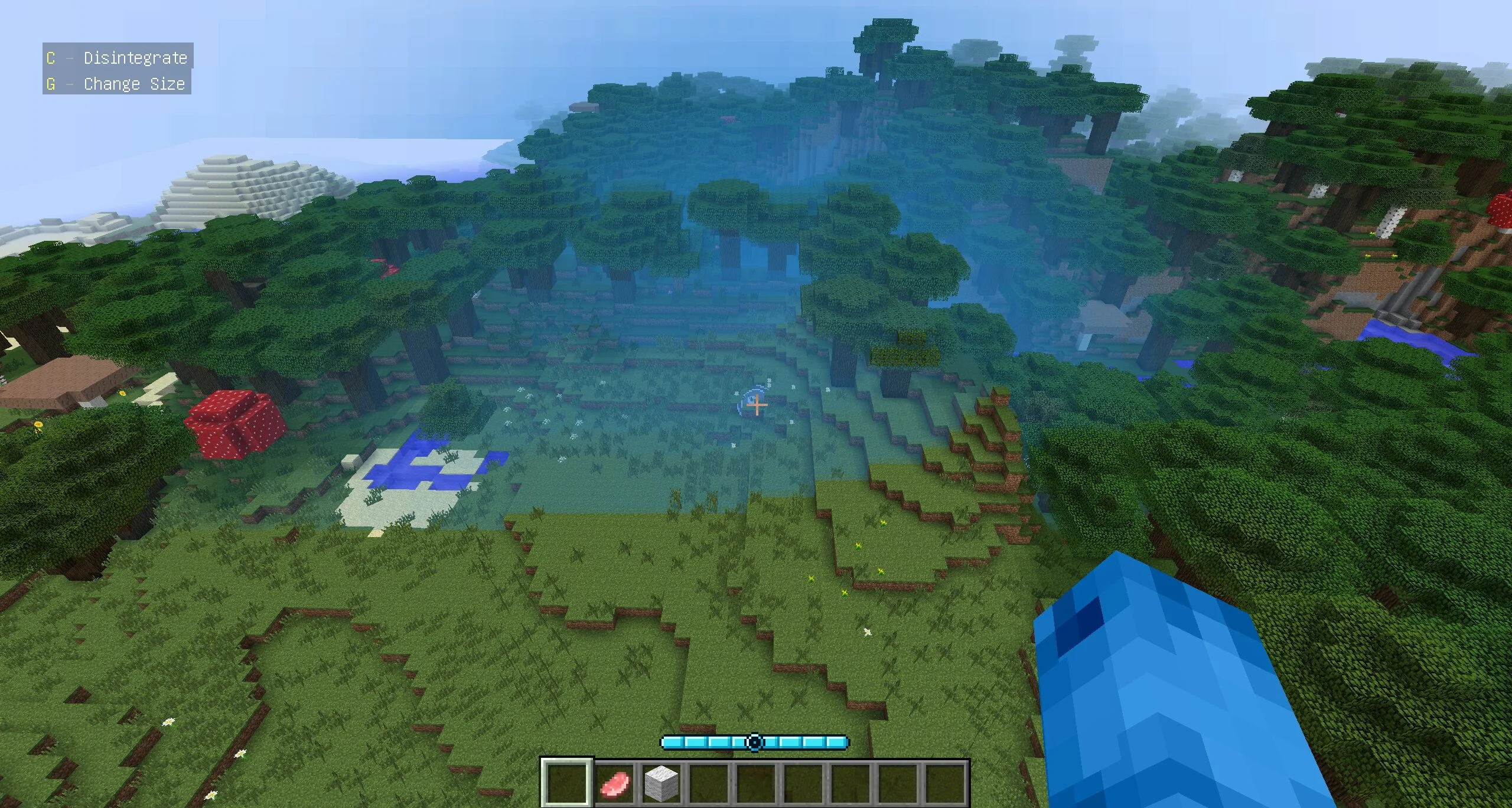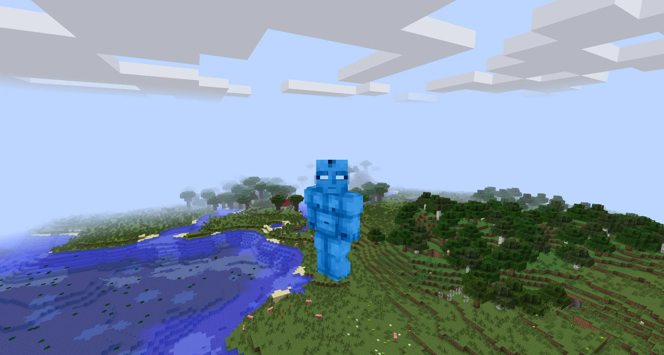 Главная способность в моде на доктора Манхэттена на Майнкрафт Ява — увеличение в размерах. Нажав на специальную кнопку, можно стать гигантом размером с гору. Даже не так — размером с несколько гор! Персонаж сможет дотянуться до облаков. А все жители кубического мира покажутся ему муравьями.