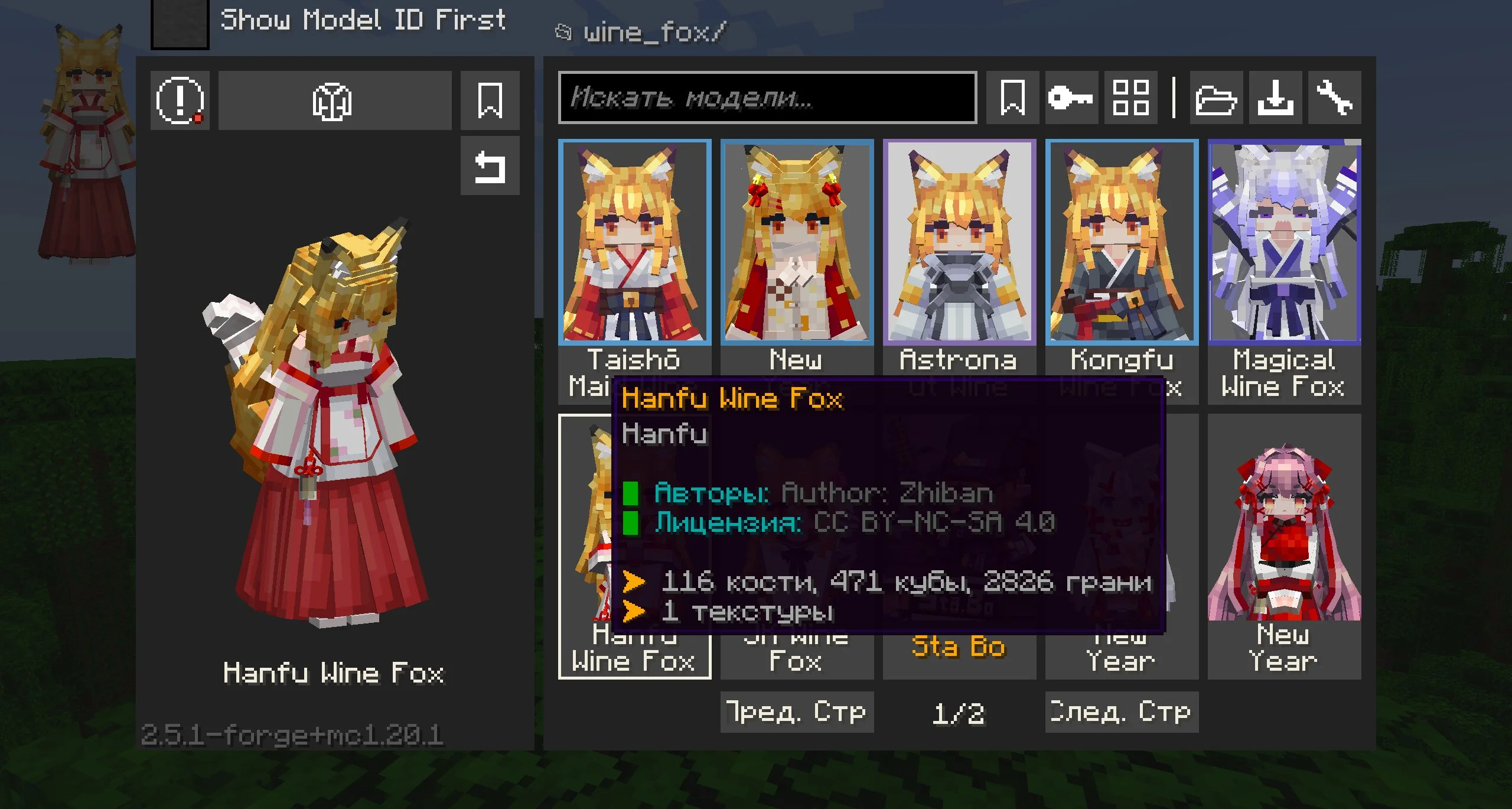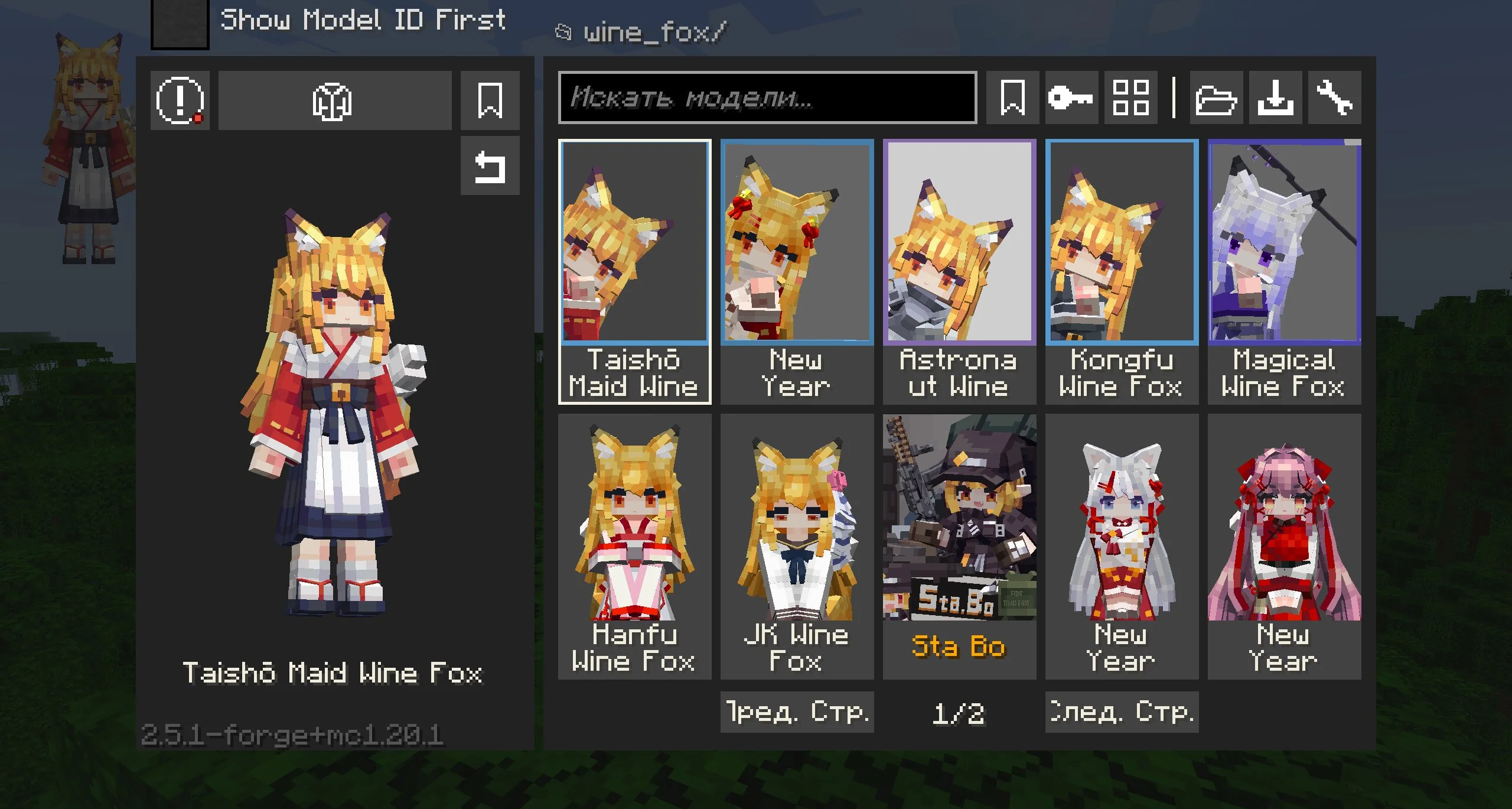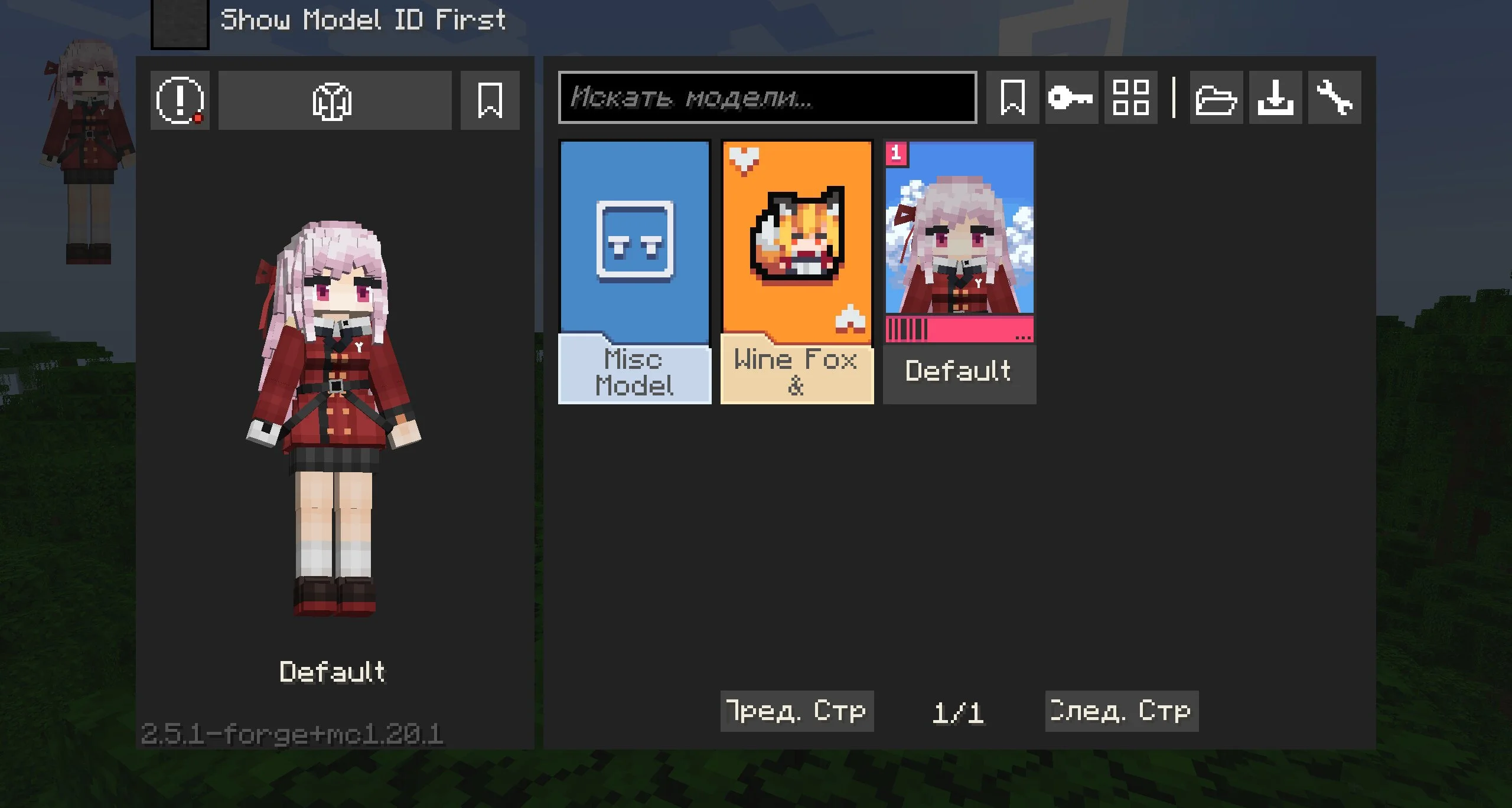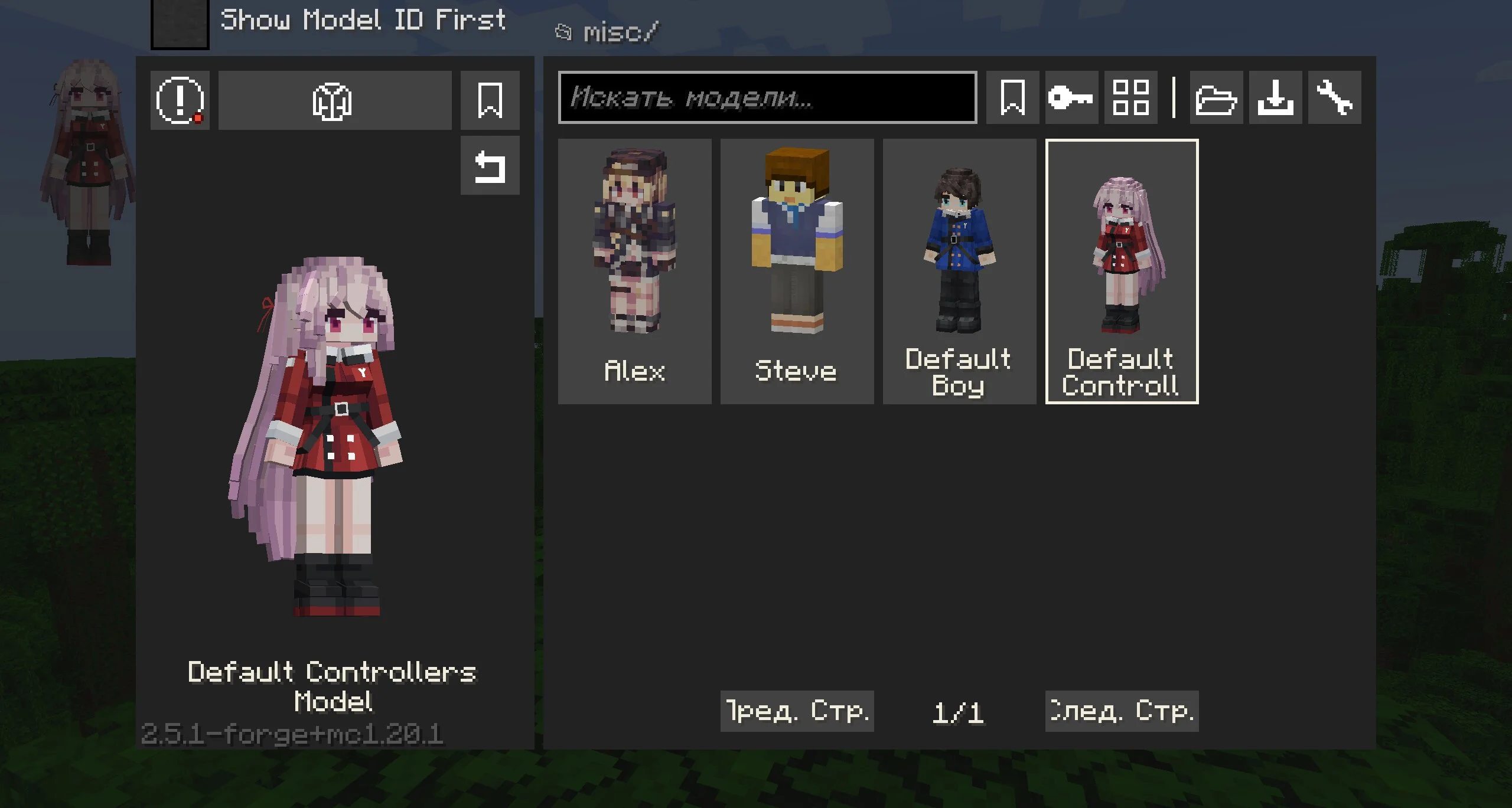 После установки мода Yes Steve Model на Майнкрафт Ява герой автоматически появляется в виде аниме-девочки. Чтобы изменить эту модельку, необходимо нажать комбинацию клавиш Alt + Y. Она открывает удобный интерфейс с целой витриной персонажей.
