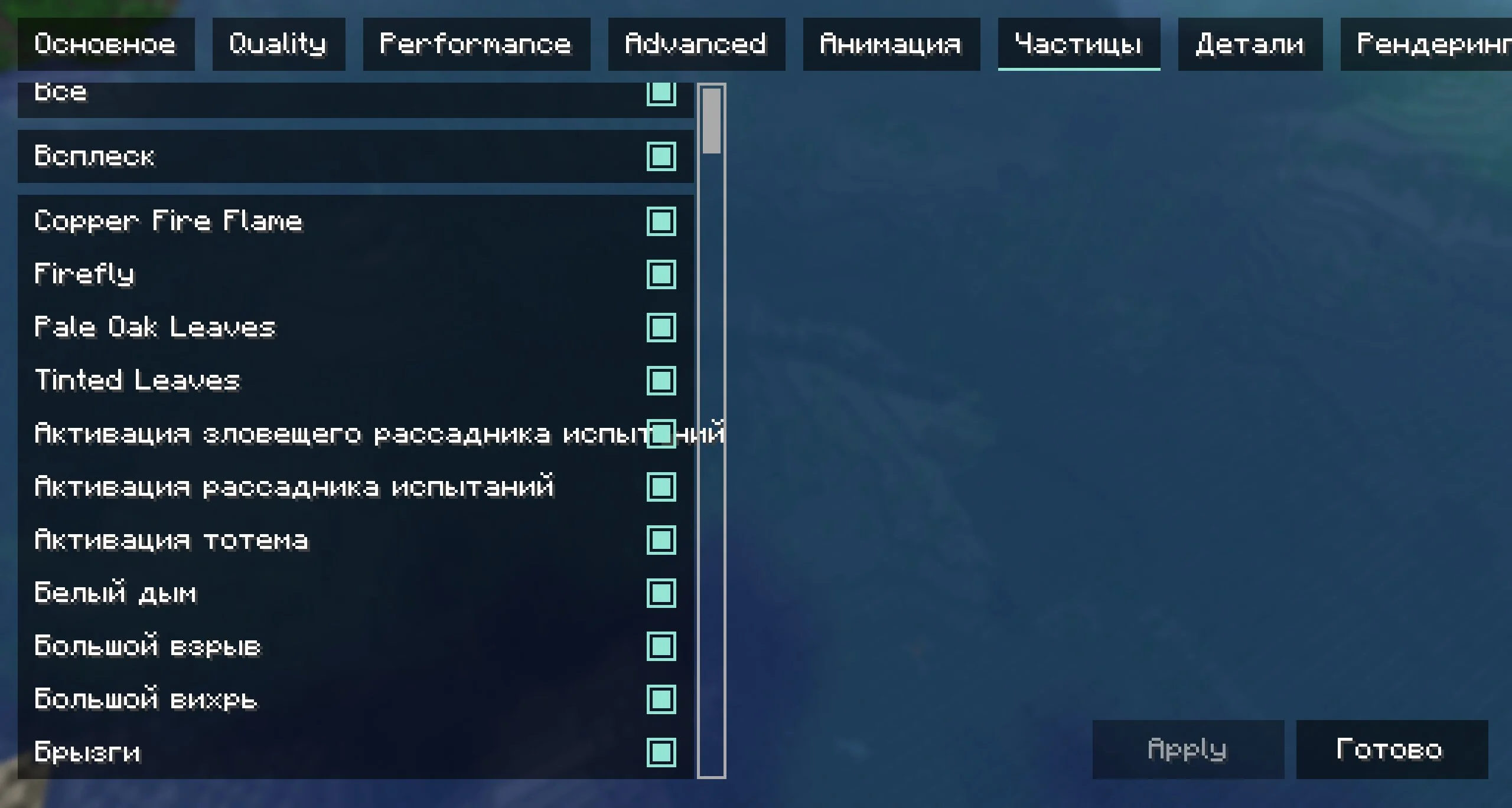 Он добавляет в меню настроек новые разделы с десятками опций. С таким дополнением пользователи могут тонко настроить свою игру, снизить нагрузку на систему или просто убрать раздражающие элементы. Можно скачать моды на Minecraft Java с другими фишками для оптимизации, в дополнение к этим.