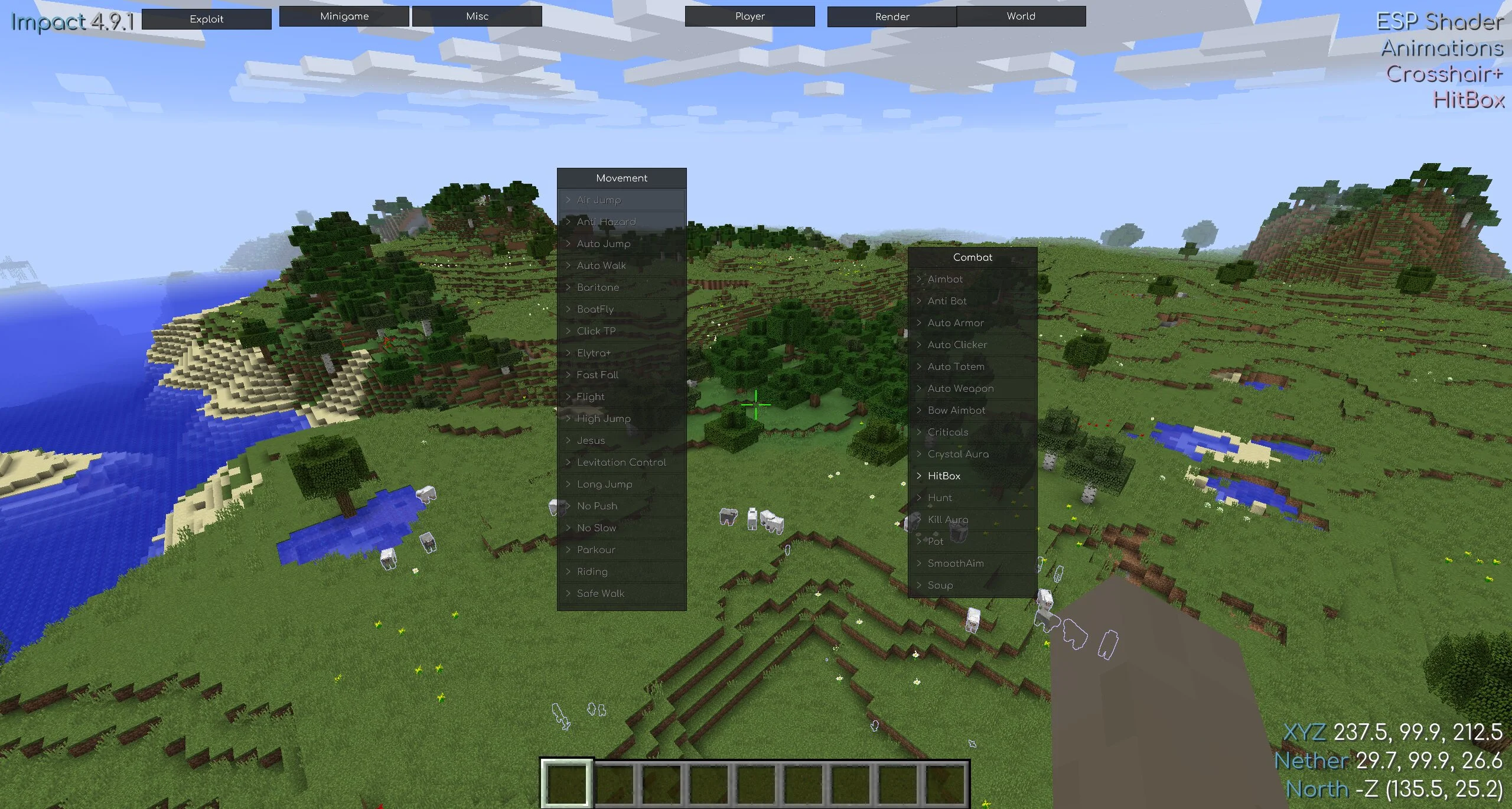 Читы для боевки, эксплойты, нечестное преимущество во время мини-игр, улучшенное передвижение по карте, скрытые возможности рендера объектов в открытом мире — здесь огромное количество пунктов, которые можно активировать одним щелчком мышки. Но также можно протестировать и другие читы для Minecraft на ПК.