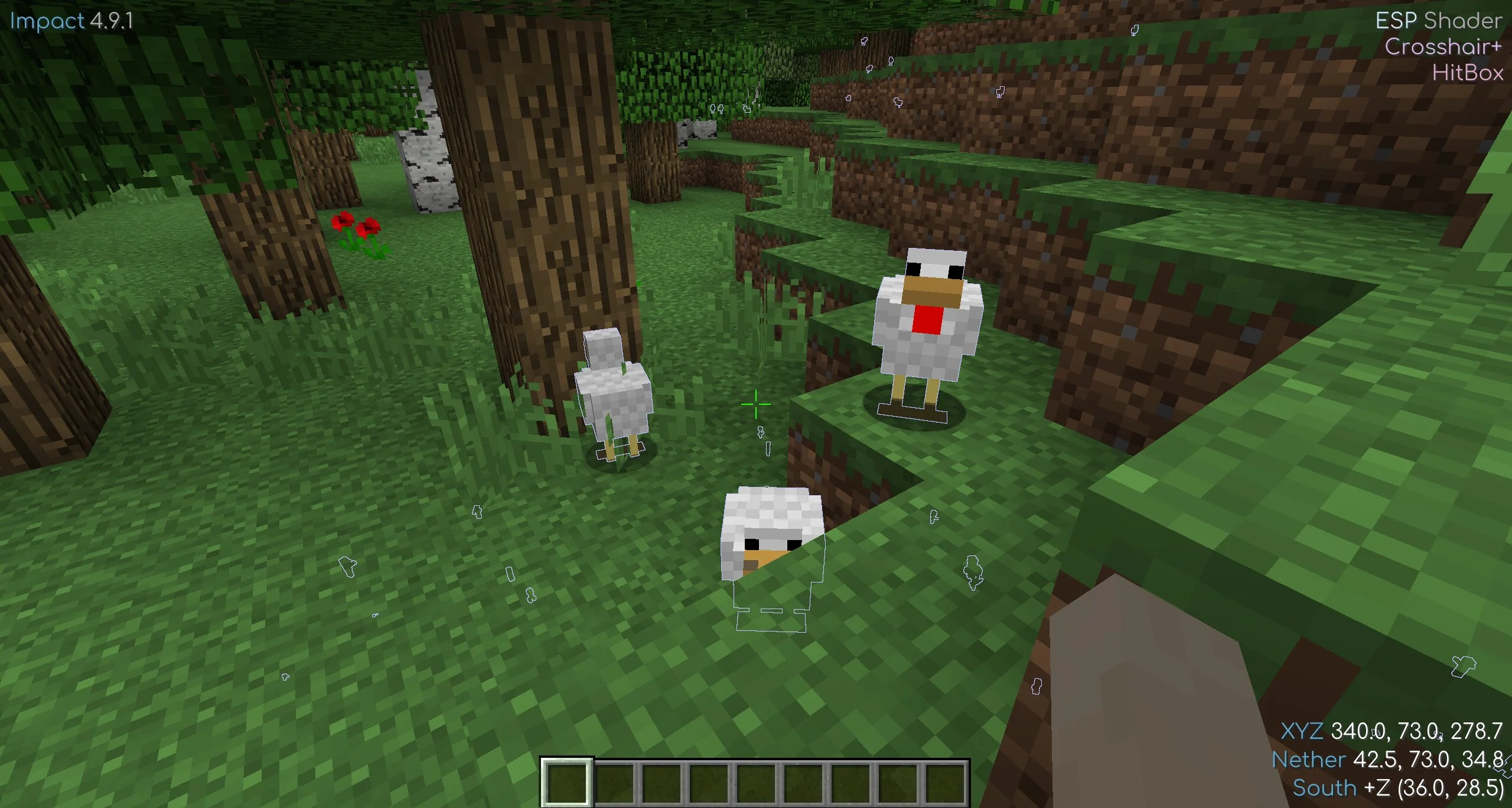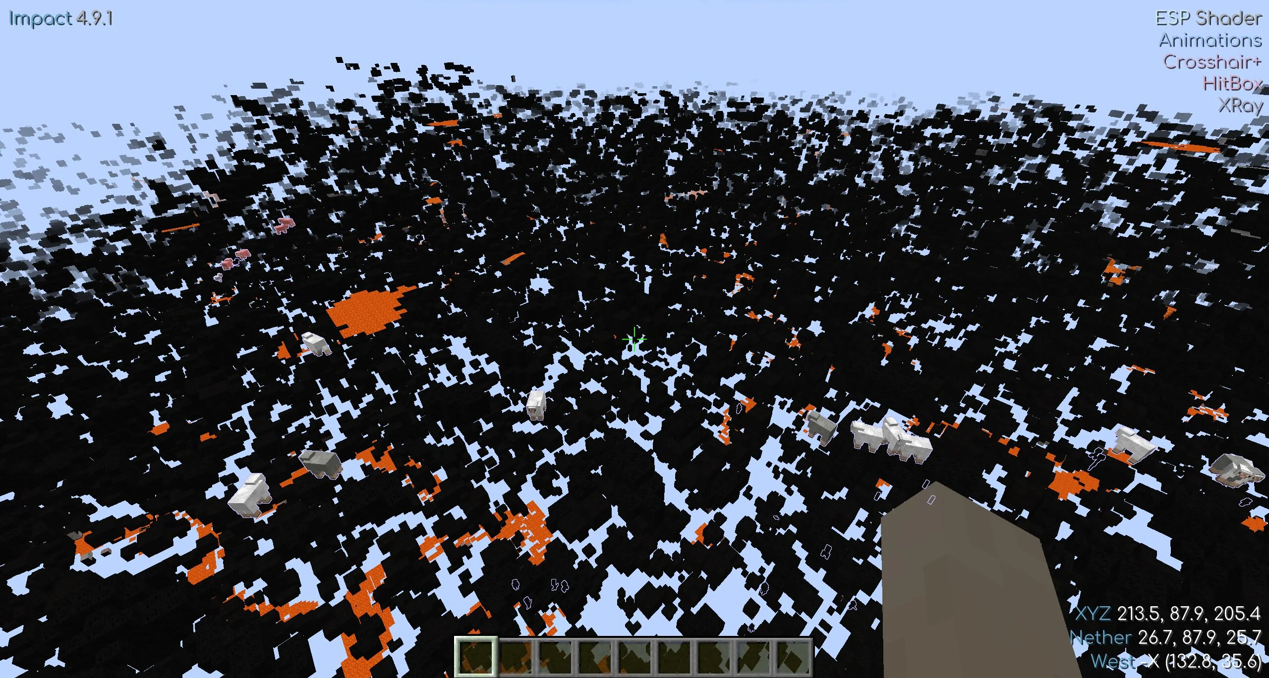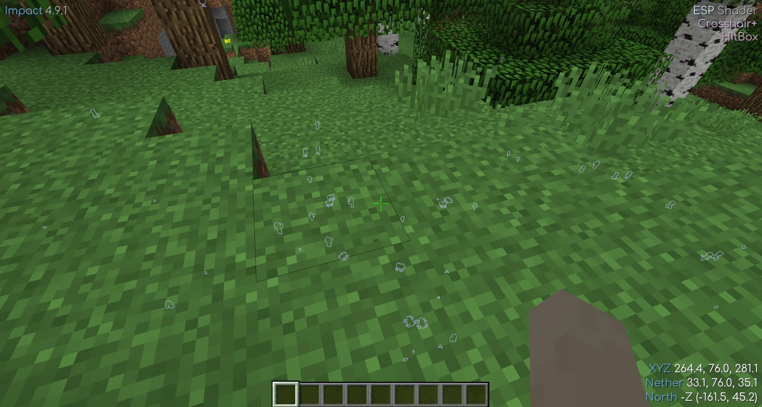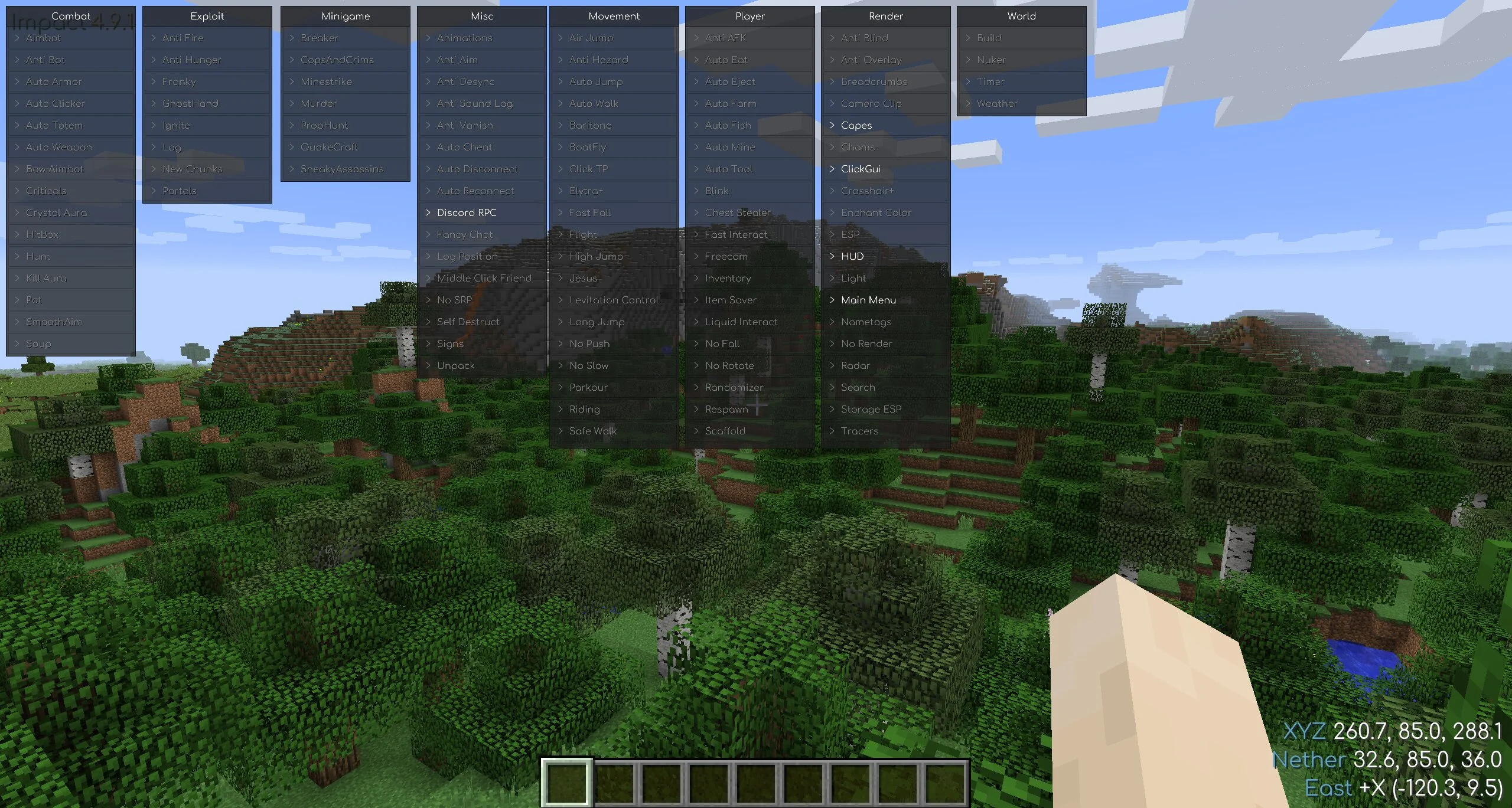 С читом Импакт на Minecraft Java возможности игрока безграничны. Можно моментально убивать врагов при помощи ауры или удобно целиться в них со включенным аимботом. Есть также система, защищающая от воздействия огня и голода.