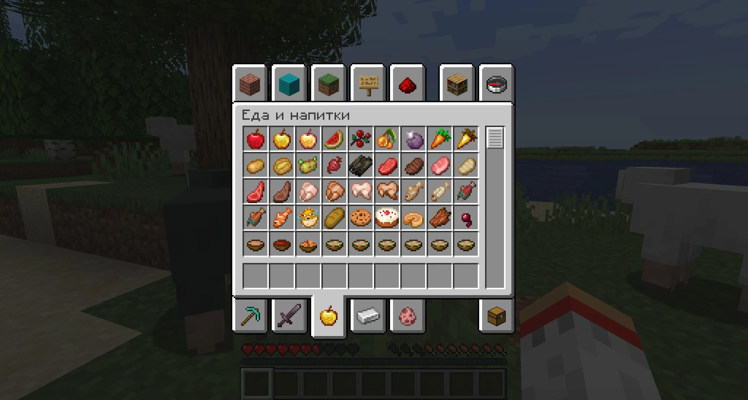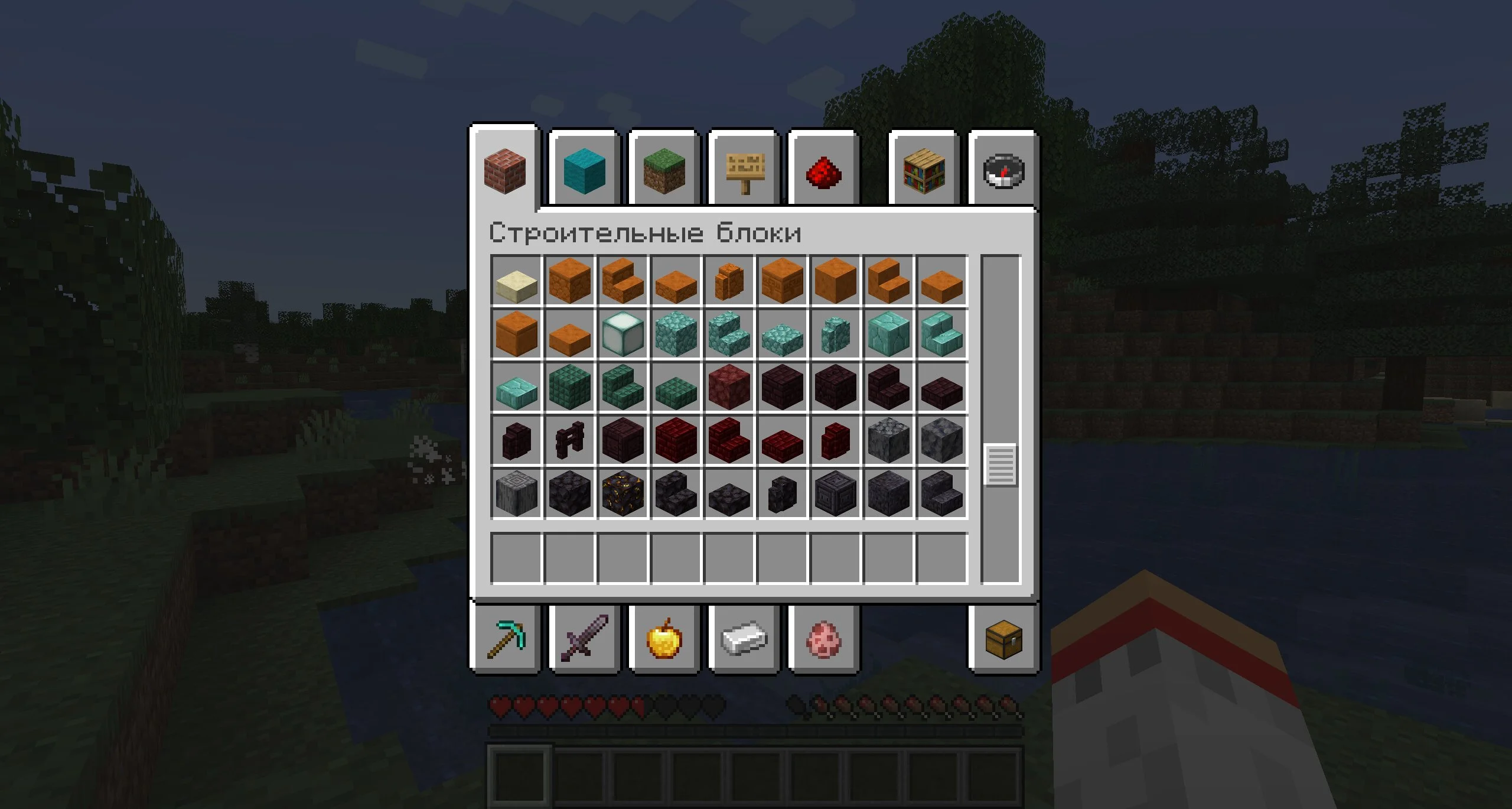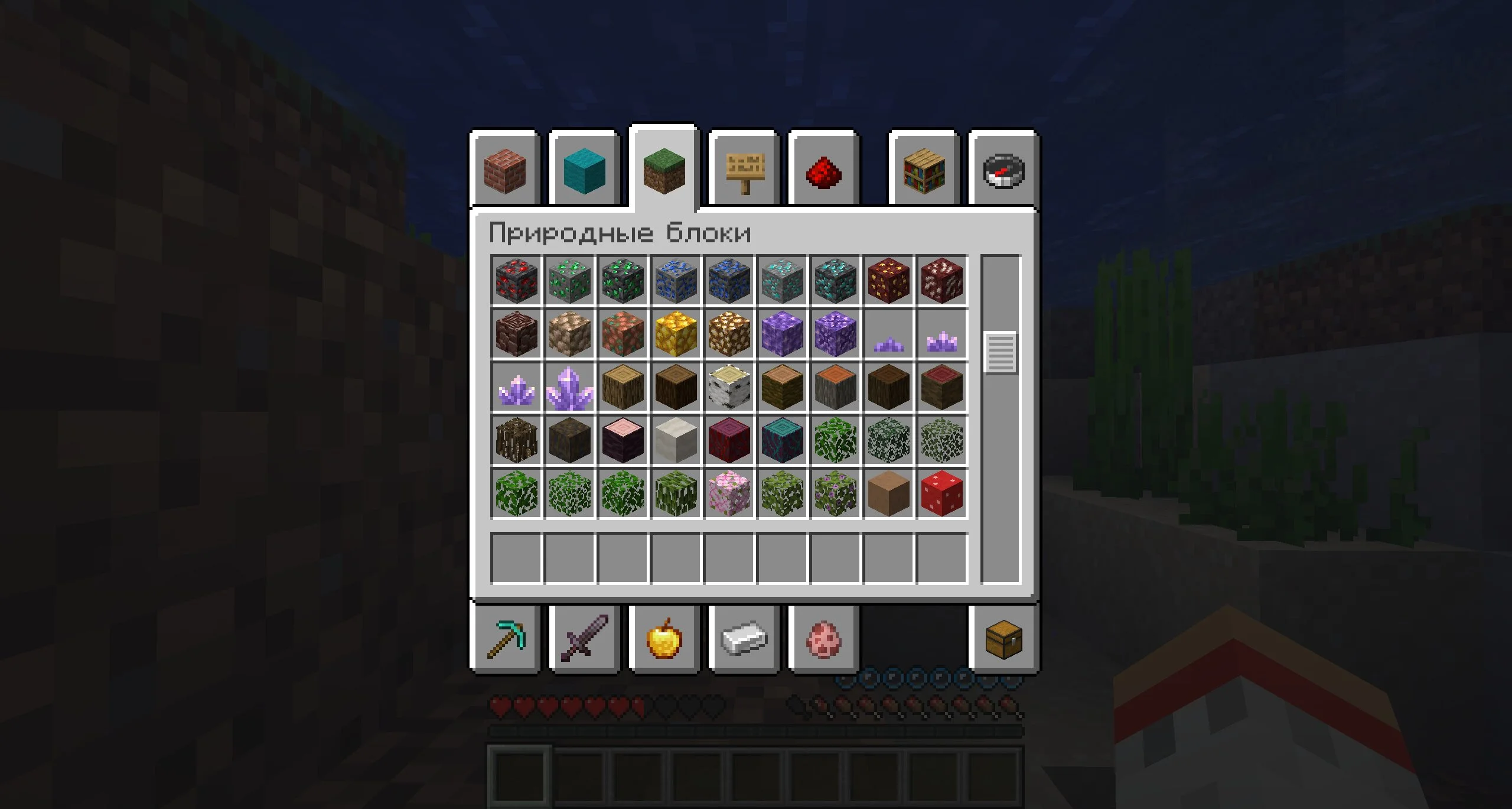Функционал у чита на предметы на Minecraft Java минимальный, но при этом очень мощный. Запустив игру в режиме выживания, нужно нажать на кнопку инвентаря. На долю секунды появится его обычная ограниченная версия, а поверх нее сразу же выскочит креативный инвентарь.