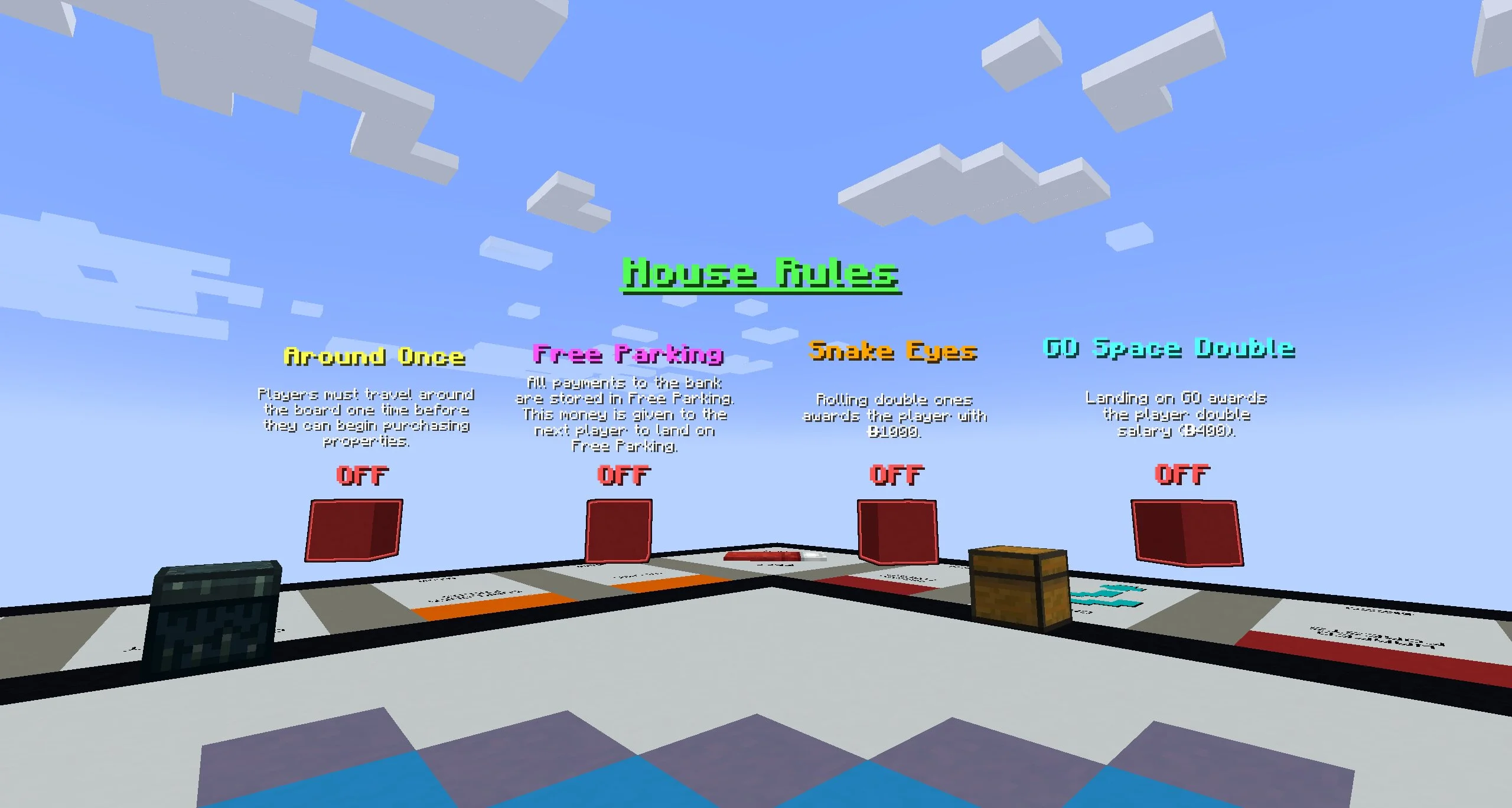 Скачайте Карту монополия для Minecraft Java и погрузитесь в увлекательный игровой процесс, превращающий знакомую настольную классику в полноценную локацию внутри кубического мира.