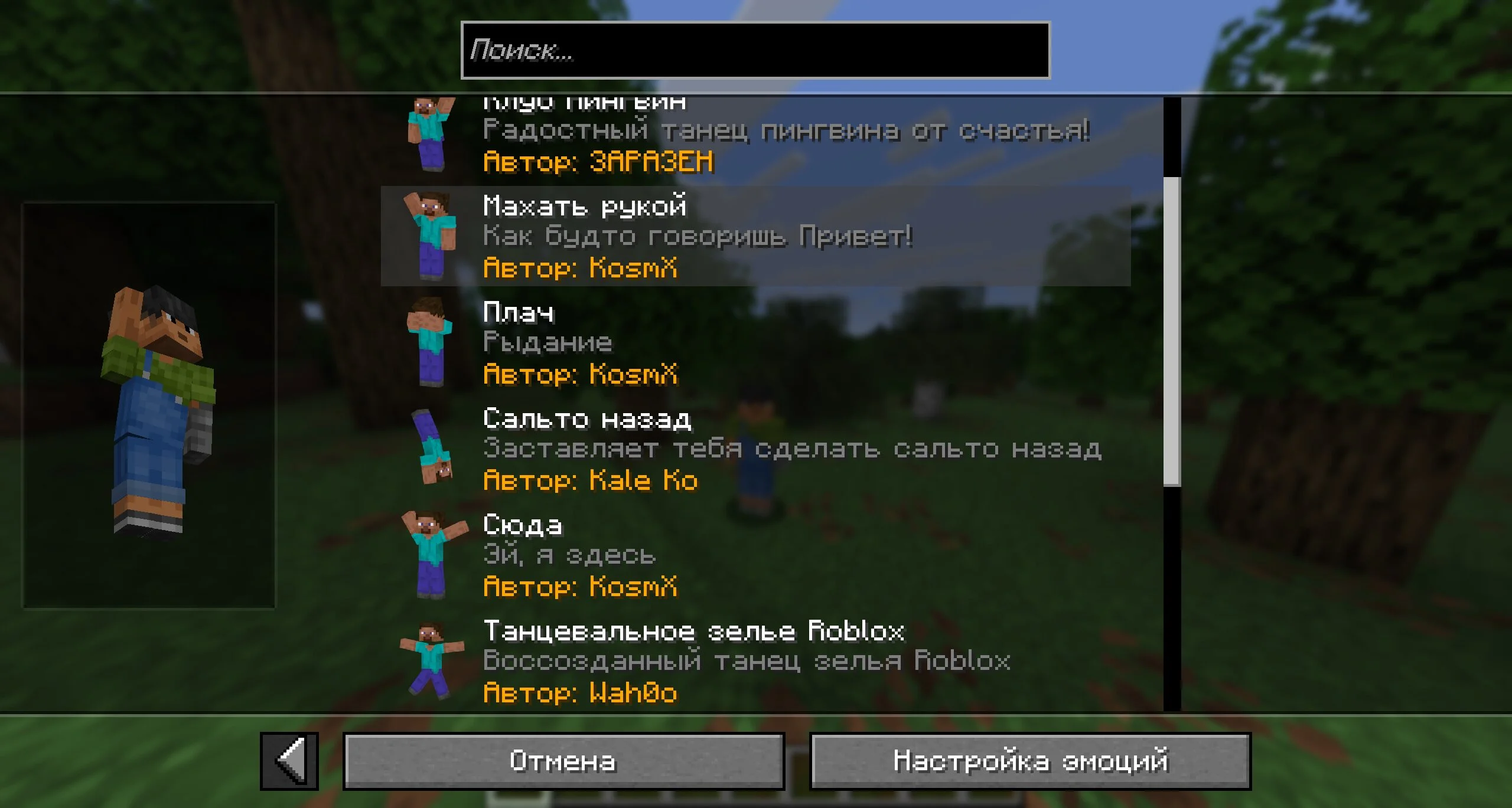 плагин Emotecraft в Майнкрафт Бедрок позволяет использовать различные анимации персонажа. Среди них могут быть жесты приветствия, радости, удивления и многие другие действия.