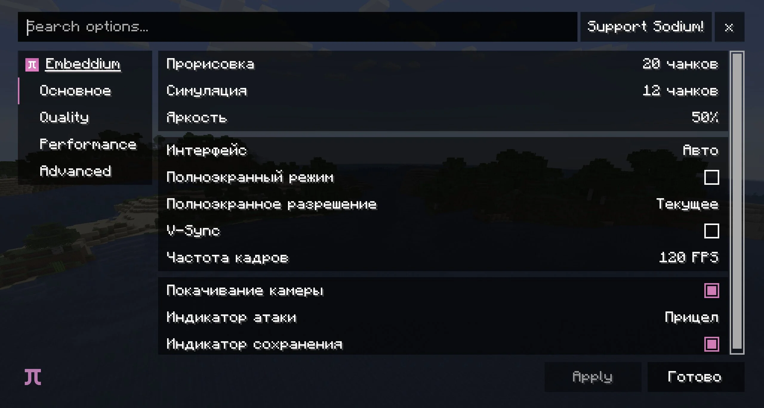мод Embeddium в Майнкрафт Бедрок предоставляет расширенное меню параметров графики. В настройках можно управлять деталями рендера, дальностью отображения и обработкой освещения.